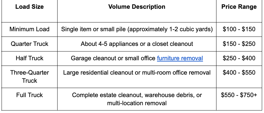 Pricing is based on volume, with jobs ranging from $100 for small loads to $750+ for full truckloads. Most residential projects cost $250 to $500, while commercial jobs typically range from $300 to $1,500.